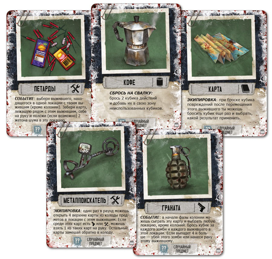 Создатели игры приготовили для вас множество картонных персонажей, карточек предметов и событий, жетонов, игровое поле с колонией выживших и 6 различных локаций, где вам предстоит разыскивать предметы, необходимые для разрешения очередного кризиса и уничтожения орд зомби (традиционные дробовики и биты с гвоздями ждут своих манчкинов).