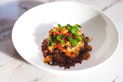 В случае с киноа мы поступаем так же: варим и заправляем той же заправкой. Киноа вообще не содержит клейковины, это очень рассыпчатая крупа, зернышко к зернышку, — прекрасная текстура, и заправки нужно несколько меньше, чем для риса.