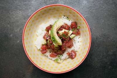 «Исторически поке — это очень простое гавайское блюдо: паровой рис, сырая рыба, соус и, возможно, овощи. Похоже на суши, только порция большая и несформованная, а рыба нарезана кубиками.