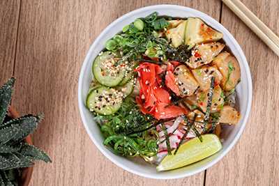 «Мы делаем поке с сырым тунцом и лососем, вареными тигровыми креветками — а также с курицей и с говядиной. Курицу мы отвариваем или обжариваем и маринуем в соусе терияки, чтобы приблизить вкус к японскому. Говяжью вырезку нарезаем, маринуем в соусе кимчи в течение 6 часов, а потом жарим. И курицу, и говядину надо использовать термически обработанную.