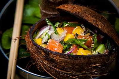 «Можно использовать практически любые овощи. Ограничения — в рамках жанра: например, свекла или картофель превратят поке в подобие винегрета. И вообще корнеплоды — не лучшая затея, они подходят для поке хуже всего. Хотя мы, например, используем батат, потому что он сладкий. Баклажаны лучше предварительно обжарить в крахмале и использовать для придания блюду хрустящей текстуры. Хорошо сочетаются с поке фрукты: ананас, манго, маракуйя».