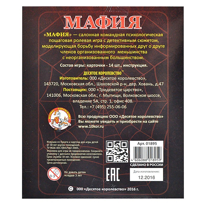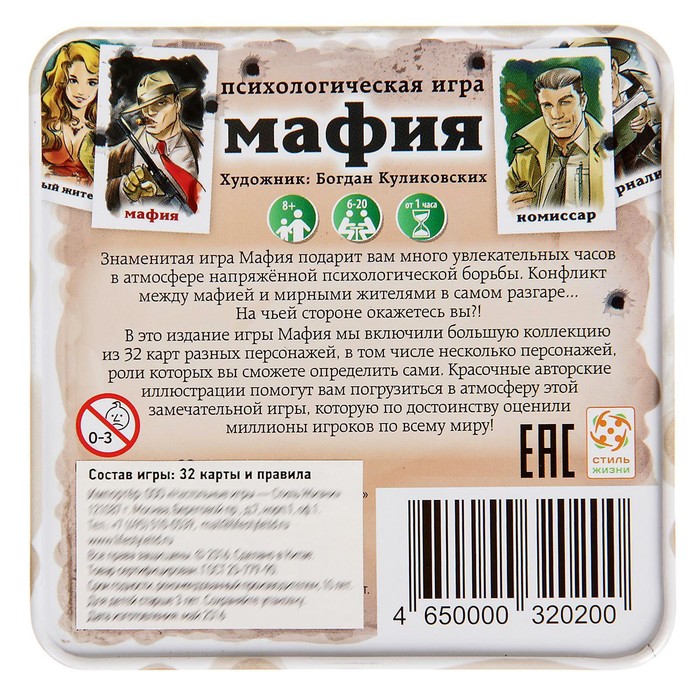 В спящем городе, скрывшись под масками добропорядочных граждан, действует мафия. И если бы она одна! Среди прекрасно нарисованных карт выделяются одиночки и даже якудза: неожиданный ход, превращающий знакомую многим игру в противостояние всех против всех. Подростки оценят подобный подарок: их роли позволят им вполне законно восстать против власти или же, наоборот, помогут защитить город от разгула преступности. Подарив же набор для игры взрослым, можно порадовать их возможностью применить все те навыки и умения, которые они обрели в обществе. Напряжённая атмосфера, интриги, незримо плетущиеся среди заговорщиков, тонкий расчёт и актёрское мастерство — всё это в удобной коробке карманного формата.