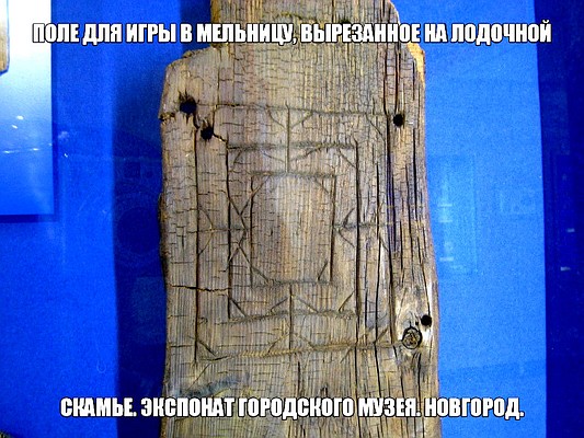 «Mylna», как её называли викинги, оказалась, наверное, единственной игрой, которую они позаимствовали в своих грабительских походах и сохранили практически неизменённой. На территории Руси в средние века в Мельницу играли, пожалуй, только на Псковщине и в Новгороде, куда её завезли всё те же варяги – там найдены фрагменты игровых полей и хорошо сохранившиеся доски, одна такая, вырезанная на лодочной скамье, сегодня экспонируется в городском музее.