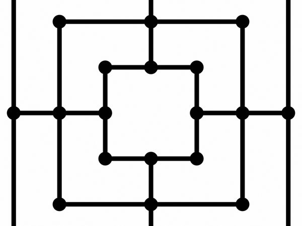 Самые захватывающие всё-таки большие Мельницы с 9-ю и 12-ю фишками. Доски для них чаще всего представляют собой три квадрата, вписанные один в другой (различия только в том, как и сколько линий их соединяют). 9-шашечная Мельница – классический и самый древний вариант большой Мельницы. На таком поле три квадрата, вписанных друг в друга, и нет диагоналей – только прямые углы.