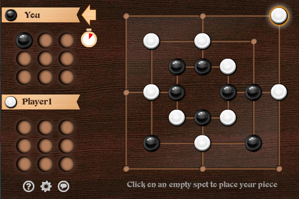 2. Фишки расставлены и начинают двигаться. Ходить можно только по линиям на соседний перекрёсток (в некоторых вариантах — ещё и прыгать друг через друга, но только не с линии на линию). Цель прежняя – выстроить три фишки в ряд, что позволит «смолоть» фишку противника.