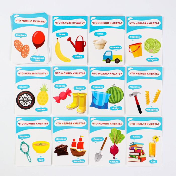 На развитие внимания играют так. Карточки кладут изображениями вверх. Ребята берут по 10 жетонов. Участники размещают на поля жетоны. Первый игрок кидает кубик. При попадании несъедобной или не съестной картинки побеждает тот человек, который первым поставил ставку на игровое поле.