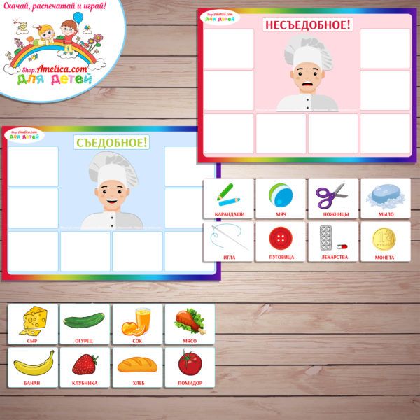 Развлечение «Съедобное-Несъедобное» развивает фантазию, скорость реакции, чувство юмора. По отзывам пользователей игра интересна, выручает в пути. Мамочки распечатывают поле, экономя деньги. Для этого нужно скачать шаблоны.