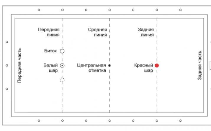 В начале игры шары выставляются в позицию, изображенную на рис. 2, и первый удар проводится битком обязательно по красному шару. Правила игры, в сущности, немногочисленны. Если при ударе чужсй шар вылетает за борт, он просто выставляется на свою первоначальную точку без каких-либо последствий для бьющего. Вылет за борт своего шара влечет переход права на удар к сопернику, который начинает серию из начальной позиции. Кроме того, бьющий может потребовать восстановления начальной позиции и в том случае, если его биток встал вплотную к красному шару.