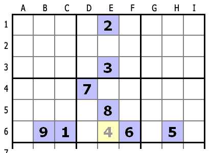 Метод похож на предыдущий, но сложнее. Его применяют, когда один из кандидатов присутствует в трех рядах (не более) и при этом — в одних и тех же трех колонках.