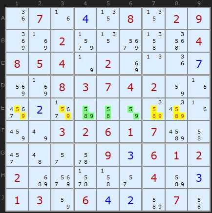 Смотрим дальше на четвёртый квадрат, у нас имеется тройник — это клетки e1, d2, e3, которые имеют кандидатов 2, 8 и 9. Уберём их из осталных незаполненных клеток четвёртого квадрата. Идём дальше. В квадрате шесть цифра пять может быть только на е8.
