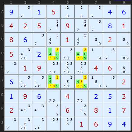 Это один судоку, где рассматривается один числовой столбец. 2 числа 4 (отмечены красным) исключаются 2 разными способами – при помощи скрытой пары или при помощи голой пары.
