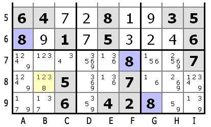 Рисунок 5 иллюстрирует наши труды. Что нам остаётся делать дальше? Конечно снова перебирать варианты простановки цифр! Ставим в клетку g1 тройку. Как всегда сохраняемся, дабы можно было вернуться. На i3 ставится единица. теперь в седьмом квадрате мы получаем пару h3 и i2, с цифрами 2 и 8. Это даёт нам право исключить эти цифры из кандидатов по всей незаполненной вертикали.