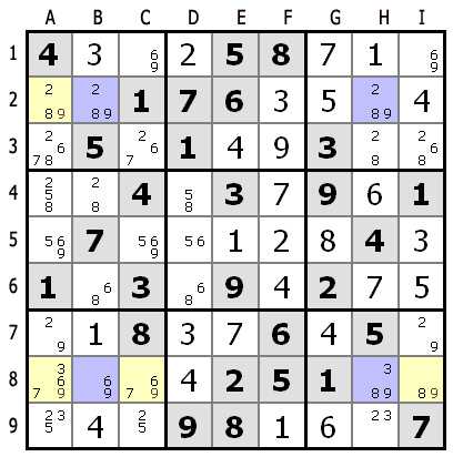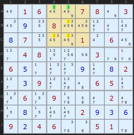 - Поскольку B3 и C2, B9 и C8 находятся внутри одной области, 9 может быть исключена из остальных клеток этих двух областей.