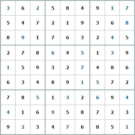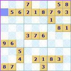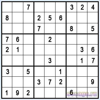 Задачей головоломки является заполнить пустые клетки недостающими цифрами таким образом, чтобы во всех столбцах, строчках и квадратах цифры не повторялись.