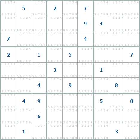 Кандидатов будем расставлять мелким шрифтом зелёного цвета, чтобы отличать от уже стоящих цифр. Делаем мы это механически, просто перебирая все пустые клетки и вписывая в них цифры, которые могут в них стоять.