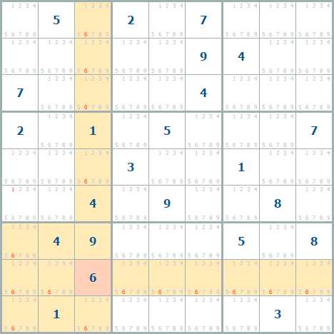 И из этого можно сделать вывод, что если у нас свободны 9 клеток в строке, и среди них точно есть голая шестерка – то проще будет найти скрытую тройку, чем выискивать взаимосвязь между 6-ю клетками. Так же со скрытой и голой пятеркой – легче отыскать голую/скрытую четверку, поэтому пятерки даже не ищутся.