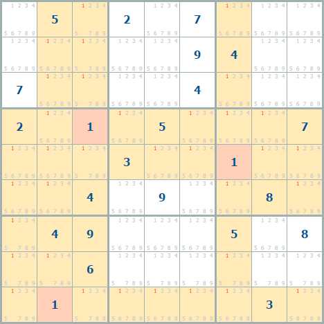 Самые сложные варианты игры предполагают большое количество вариантов заполнения каждой клетки. Иногда их может быть максимально возможное количество — 8 или 9. В таких ситуациях рекомендуется записывать карандашом всех варианты по краям и углам клетки. Перечисление всех комбинаций, при детальном изучении, уже может помочь исключить пересекающиеся числа и сократить количество вариаций для отдельно взятой клетки.