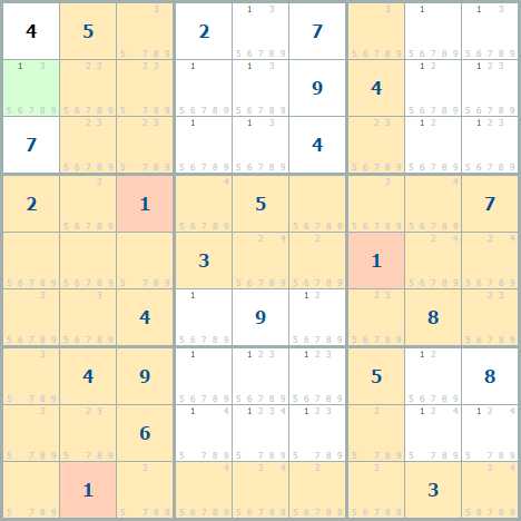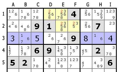 Если в группе кандидатов есть две клетки с одинаковыми парами, эти кандидаты не могут находиться в других клетках ряда, колонки или области.