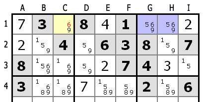 Если несколько клеток содержат общие числа, которые не встречаются в других клетках группы, остальные кандидаты для этих клеток могут быть исключены.