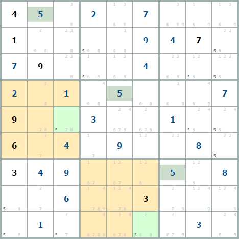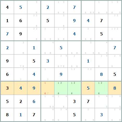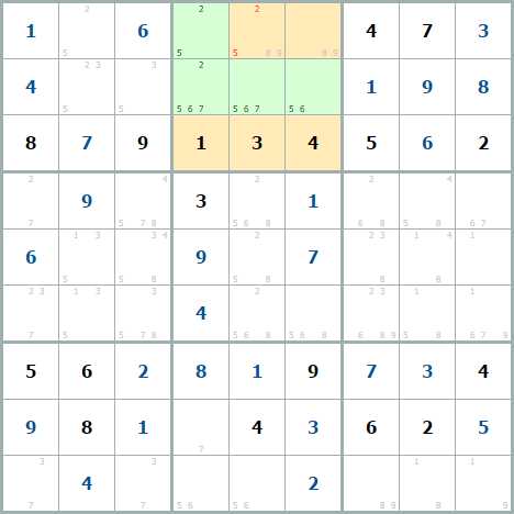 Другой судоку, где в одном квадрате одновременно голая пара и скрытая тройка, которые удаляют одни и те же числа.