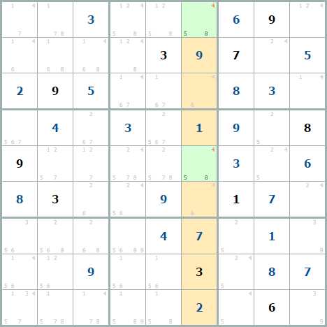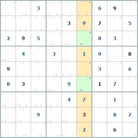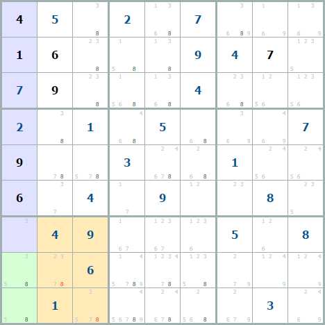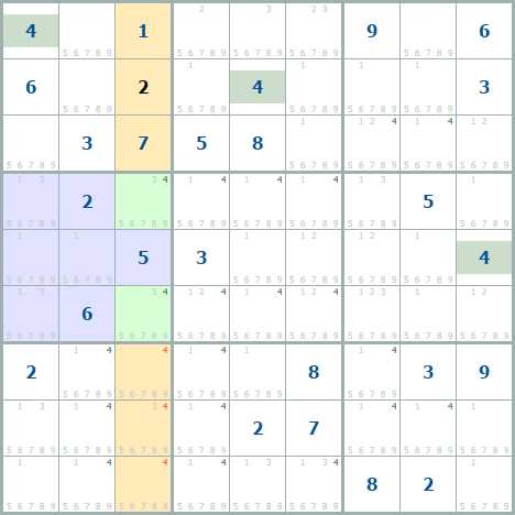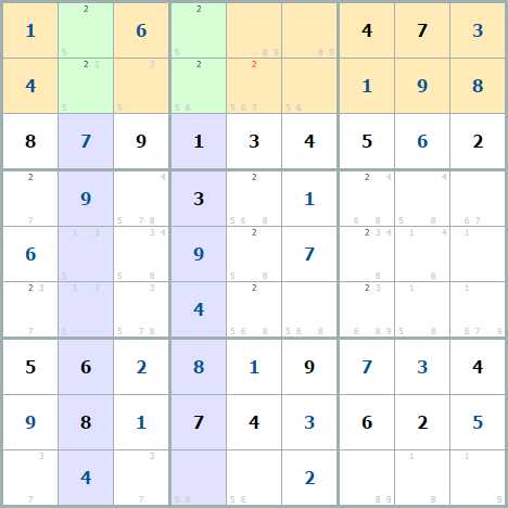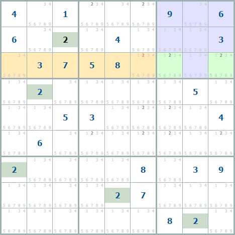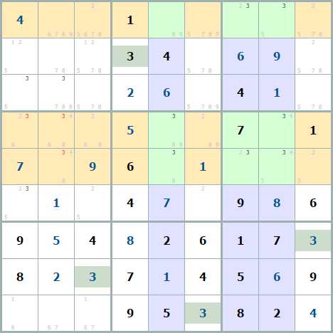 Но цвет можно использовать и при решении обычного судоку, отмечая более вероятные случаи подстановки. В приведенном выше изображении головоломки, цифра 4 может быть поставлена только в синие и оранжевые клетки, все остальные варианты заведомо ошибочны. Выделение указанных областей позволит отвлечься от цифры 4 и переключиться на поиск других значений, при этом забыть о клетках окончательно не получится.