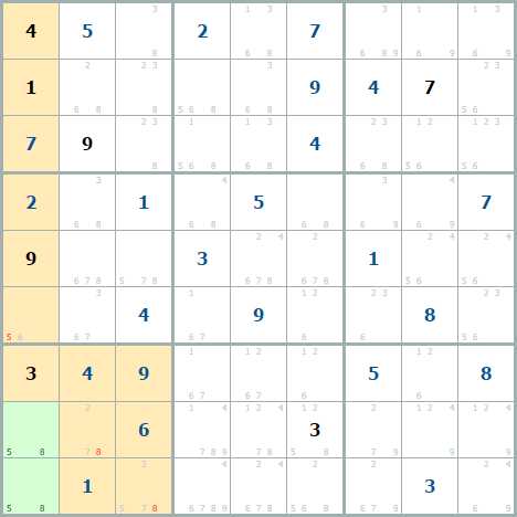 А дальше мы проставляем девятый квадрат. После того как мы удалим проставленных кандидатов, то обнаружим что i8 — шестёрка, а g8 единица. На h7 ставится двойка.