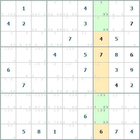 Рисунок 7 иллюстрирует наши труды. И нам остаётся совсем немного! h5 шестёрка, h5 семёрка, а h6 единица. В восьмом квадрате у нас получается пара g5 g6, с кандидатами 2 и 4, потому четвёрки на i4 быть не может и тут мы ставим восьмёрку. А потом на I9 четвёрку. Далее g6 восьмёрка, а f9 единица. f7 четвёрка.