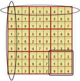 - Группа. Групп несколько: ряд — 9 горизонтальных клеток; колонка — 9 вертикальных клеток; область — малый квадрат размером 3×3 клетки. В каждом судоку 9 областей.
