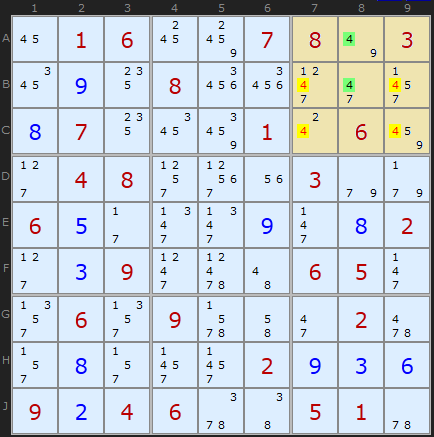 Но 1, 7 и 6 уже есть в общей строке. Значит, остаются всего два варианта: 2 и 9. Однако 2 присутствует в общем столбце, поэтому итог перебора выглядит так: