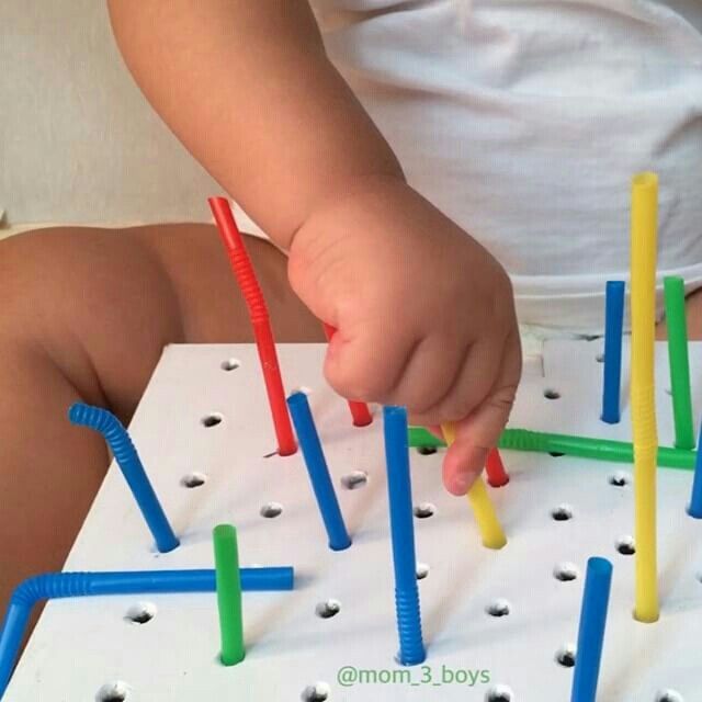 • Познает «прямые и обратные действия». Например, складывает и раскладывает, надевает кольца на стержень и снимает их. В этих активных действиях складывается представление ребенка о себе как об активном, действующем человеке!