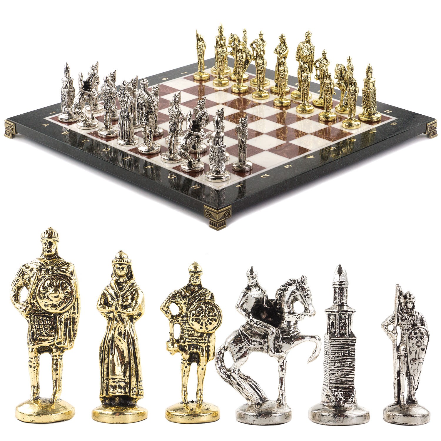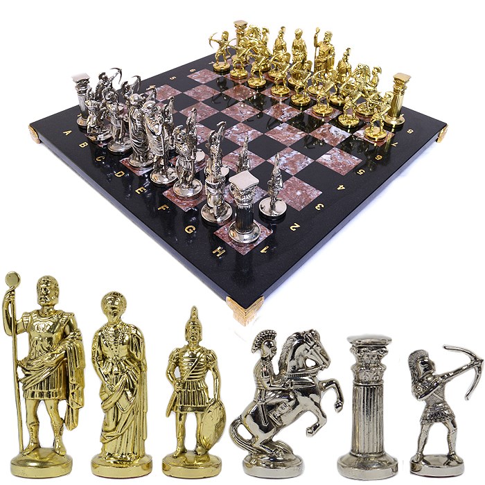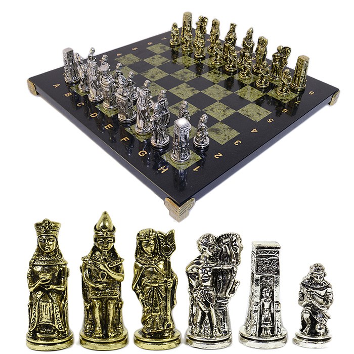Этот элегантный набор выполнен настолько тонко, что его можно рассматривать как изящный интерьерный декор. Укомплектовывается игральный комплект добротным кейсом, где для каждой фигурки найдется свое законное место. Сами фигуры выполнены из бронзы и цинка в античном стиле, что не может не вызывать восторга.