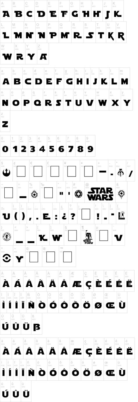 Чтобы придать ему этот шрифт «Звездных войн», вы можете использовать эту галерею значков, текстов, абстрактных мини-символов, которые придадут идеальный вид научной фантастики. Это абсолютно бесплатный шрифт Star Wars от Boba Fonts.
