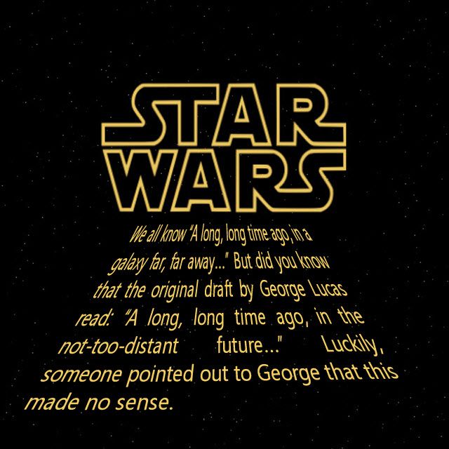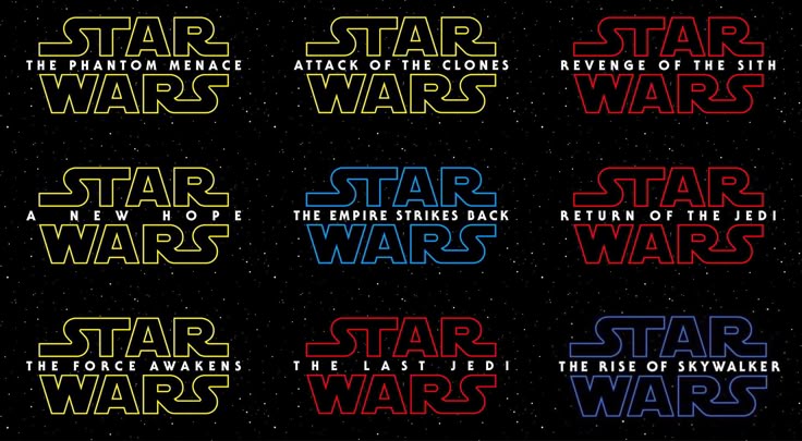 Первый фильм «Новая надежда» начался с логотипа, который представлял собой широкую желтую типографику с заостренным верхом. Знакомые прокручивающиеся слова «Давным-давно, в далекой-далекой галактике…» естественным образом сдвинули логотип в сторону этого косого взгляда.
