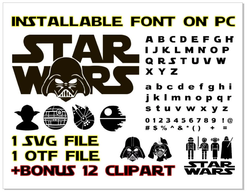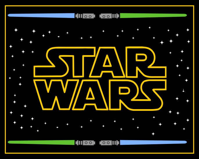 Шрифт «Звездных войн» с небольшой обводкой для создания ретро-стиля идеально подходит для видео или может использоваться в качестве основного логотипа на футболке, кружке или рамке!