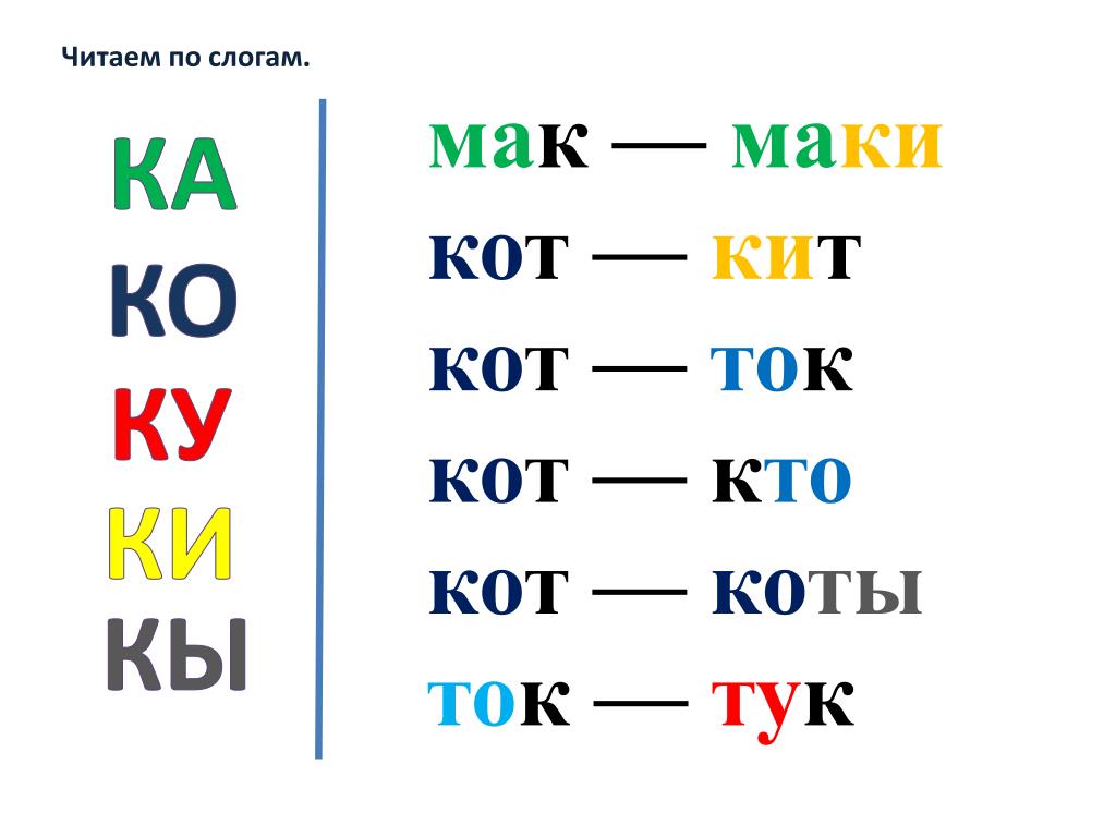 Методика обучения малышей чтению базируется на делении слов на отдельные слоги. Сначала ребенок учит буквы и объединяет их в слоги, а затем начинает учиться читать слова по слогам. Когда этот навык будет полностью сформирован, ребенок сможет осваивать следующий этап – чтение слов целиком, на одном дыхании.