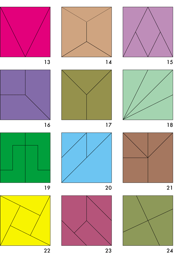 8. И, наконец, вершина усложнения игры и безграничное ее расширение – придумывание и изготовление новых квадратов к уже имеющимся 24. В игре квадраты разрезаны только по прямым линиям, а ведь можно разрезать, используя окружность и ее части или другие кривые, иначе располагать линии разреза, изменять число частей, на которые делится квадрат, и т. д. и т. п. Здесь открывается необъятное поле деятельности для творческой фантазии и детей, и взрослых.