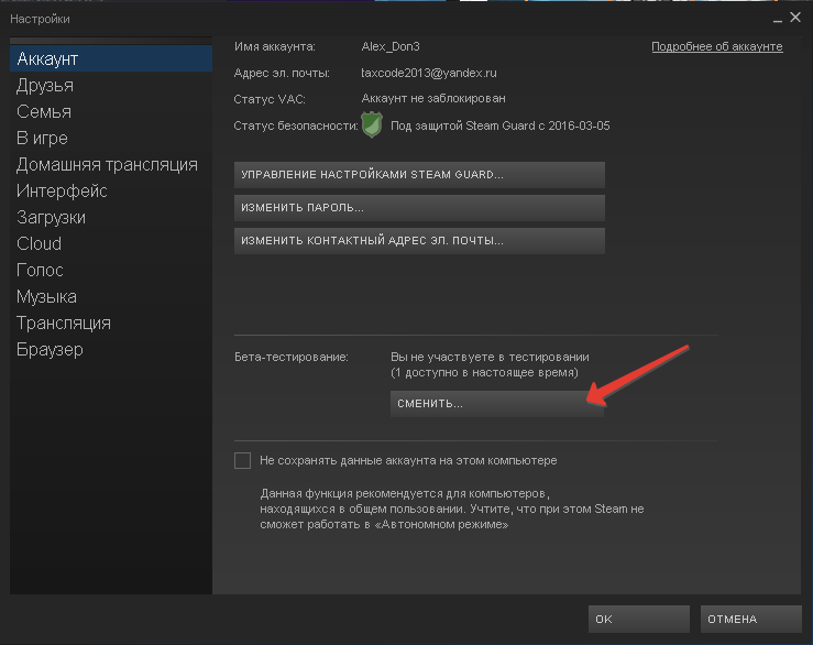 - В меню Settings выберите Account в вертикальном меню слева. Затем перейдите на правую панель и нажмите кнопку Изменить под Участие в бета-тестировании .