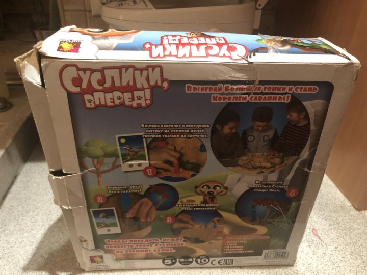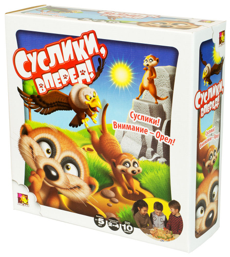 Настольная игра «Суслики, вперёд!» предназначена для детей от пяти лет, но и взрослые вполне могут принять участие – весело будет всем! Задача игроков – как можно быстрее привести всех своих сусликов на вершину холма. Проведите фигурки по одной от старта до соответствующего цветного поля на холме. Следуйте указаниям карточек – передвигайте фигурку вперёд на нужное число клеточек, вставайте на ближайшего жука или же выпускайте орла! Для этого нажмите один из рычажков конструкции. Когда вылетает орёл, нужно успеть спрятать своих сусликов, стоящих на вершине холма. Если суслик не успел спрятаться, ему придётся вернуться вниз, к подножью холма. Игра заканчивается, когда на вершине оказываются три суслика одного цвета.