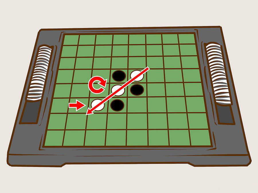 - Делая ход, игрок должен поставить свою фишку на одну из клеток доски таким образом, чтобы между этой поставленной фишкой и одной из имеющихся уже на доске фишек его цвета находился непрерывный ряд фишек соперника, горизонтальный, вертикальный или диагональный (другими словами, чтобы непрерывный ряд фишек соперника оказался «закрыт» фишками игрока с двух сторон). Все фишки соперника, входящие в «закрытый» на этом ходу ряд, переворачиваются на другую сторону (меняют цвет) и переходят к ходившему игроку