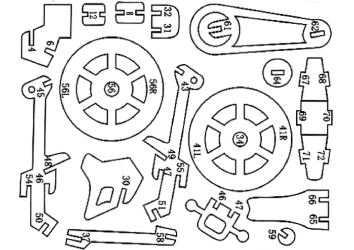 Сборка деталей поделки в данной работе не очень сложная, подробную инструкцию Вы найдете вместе с файлом чертежа. Ниже представленные основные этапы сборки. Гусеничная база.