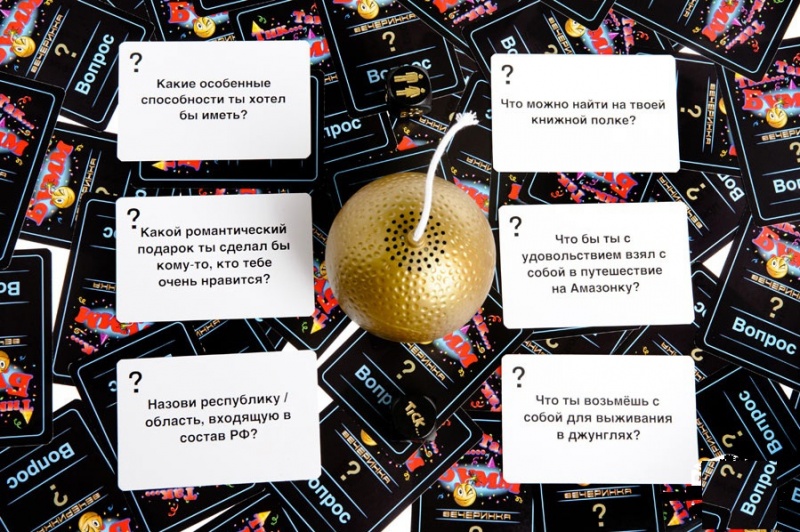 На карточке — две буквы: нужно вспомнить знаменитость, чьё имя начинается хотя бы на одну из них, а лучше — на обе. Например, Г и П — это и Гарри Поттер, и актёр Грегори Пек, ну или хотя бы Эдвард Григ или Пабло Пикассо. Если названное имя совпадает с инициалами полностью, вы до конца игры можете не брать в руки бомбу, - Вопросы. Что у тебя под кроватью? Ваше самое лучшее качество? Назовите республику в составе РФ? Главное — быстро сориентироваться и не потратить ни одной лишней секунды на ответ,