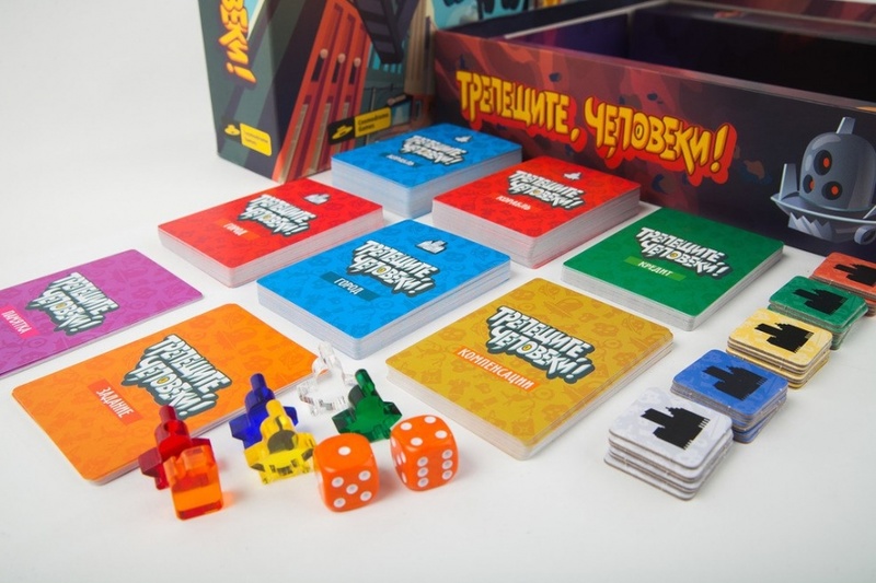 Настолка Трепещите, человеки! (далее ТЧ!) сразу удивила меня размерами коробки. Ребята, это же самый настоящий бигбокс! Большая солидная настолка. Размер такой коробки сразу настраивает на серьезную большую настолку с намеком на хардкорный геймплей. В принципе, и далее содержимое коробки продолжает намекать на это — большое раскладывающееся поле, жетоны, фишки, куча карточек — все это есть в игре. Как говорится, богато смотрится! А как же играется?