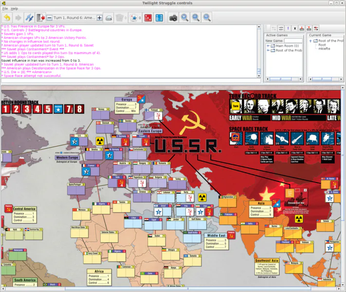 В течение первых ходов игры борьба в основном сосредотачивается в Европе, Азии и Среднем Востоке, распространяясь на другие регионы, такие как Африка и Центральная Америка, позже, так как карты подсчета очков для этих регионов появляются только после добавления колоды Середины Войны. В начале игры СССР получает определенное преимущество, так как события в Азии приводят к расширению его влияния в этом регионе. События Конца Войны, такие как «Снесите эту стену» и «Солидарность» в Польше, помогают США увеличить своё влияние в Европе, особенно в ключевой стране игры Польше, а волнения в социалистических странах Восточной Европы делают ситуацию для СССР ещё более тяжелой. Обе сверхдержавы получают в период Конца Войны сильные карты, особенно Чернобыль для США и Олдрич Эймс для СССР.
