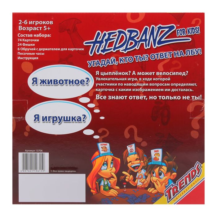 Ваша группа из двух-шести игроков будет надевать повязки на голову, задавать забавные вопросы и строить дикие предположения без сложных настроек и правил. Играть в Hedbanz просто. Раздав по одной карте и по три фишки каждому игроку, возьмите свою карту и, не выглядывая, поместите ее в регулируемую повязку. Когда придет ваша очередь, задайте каждому игроку вопрос о том, кто вы или что вы такое («Я еда?»). Если вы застряли, карточка с примерами вопросов предлагает советы по типам вопросов, которые вы можете задать. Когда вы ответите «да», ваши вопросы станут более конкретными («Я готовлю?» или «Папа подавал мне вчера на ужин?») до тех пор, пока вы не будете готовы угадать ответ («Я спагетти!»). За каждую правильно угаданную личность вы сбрасываете одну из своих фишек. Если вы сдадитесь, вы возьмете фишку из банка фишек и получите новую карту. Игрок, первым избавившийся от всех своих фишек, становится победителем Hedbanz.Обзоры экспертов