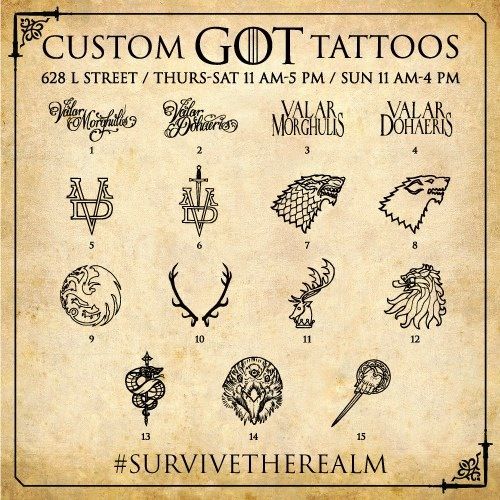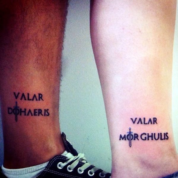 С высокого валирийского языка фразы переводятся как «все люди должны умереть» и «все люди должны служить». Кстати, для сериала грамматику языка придумал лингвист Дэвид Петерсон. Он же разработал и дотракийский язык.