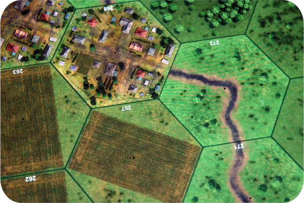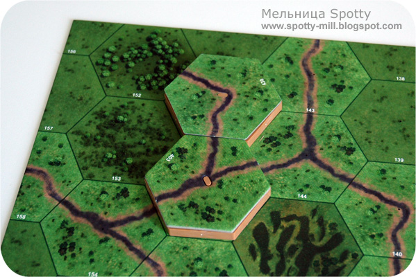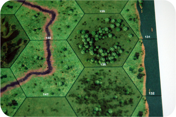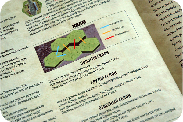 Расположив отряды на начальные позиции, кратко рассмотрим основные принципы влияния местности на характеристики отрядов. Начнём с холмов, которые имеют различную высоту, и, соответственно, три типа склонов: пологий (на 1 уровень выше), по которому любым подразделениям можно передвигаться только на 1 гекс в течение хода; крутой (на 2 уровня выше) — по нему может взобраться только пехота; отвесный (на 3 уровня выше) — тут понадобится навык альпинизма, который указан в карточке отряда.