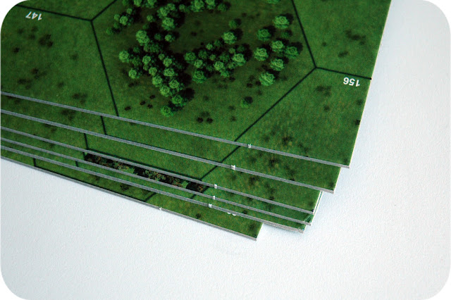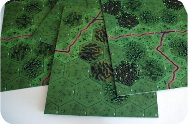 Шесть двусторонних прямоугольных сегментов игрового поля, поделённых на пронумерованные шестигранники, на каждый из которых нанесён свой тип местности. Поле составляется из данных частей в соответствии с картинками из книги сценариев.
