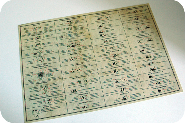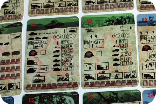 Карточки отрядов, счётчик ходов, карточки групп, минные поля, склады, удары авиации: всего 29 игровых карт, покрытых специальным слоем. На них игроки и будут одновременно делать соответствующие пометки по системе Art of Tactic, разработанной Константином Кривенко. Для поддержки игроков существует официальный русскоязычный ресурс, на котором размещены дополнительные сценарии и актуальные на данный момент правила со всеми поправками. Рекомендую его посетить.