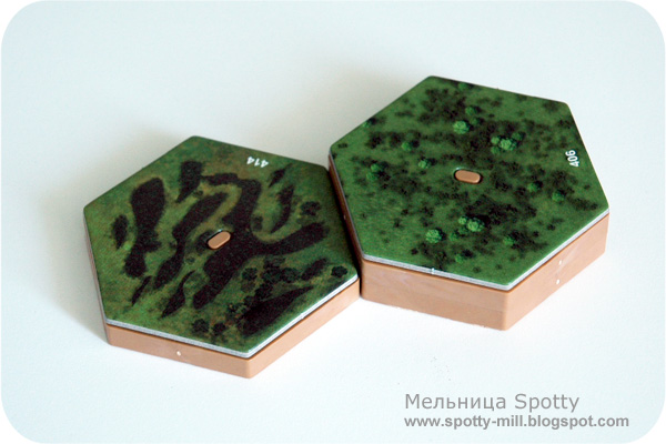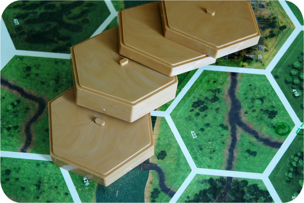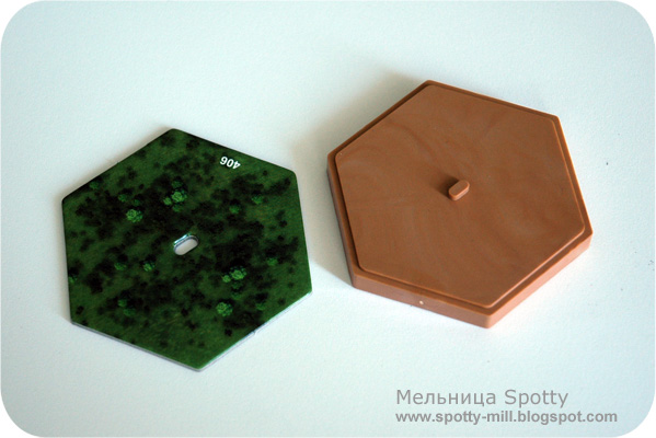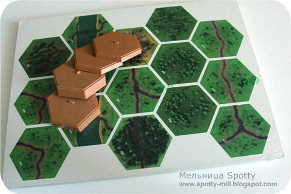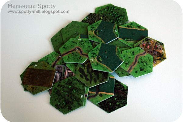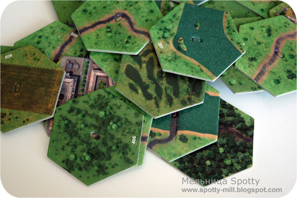 Населённые пункты, элементы местности, инженерные сооружения: 30 двусторонних тайлов предназначены для размещения на поле и изменения базового ландшафта. В центре гекса сделана прорезь, которая совпадает с выпуклостью на пластиковом элементе — очень грамотное решение, предотвращающее смещение картонки относительно основания.