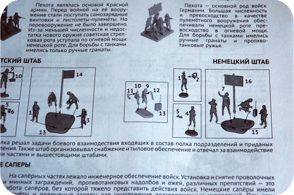 Миномётный расчёт, три подразделения пехоты, сапёры, пулемётный расчёт и штаб. Многие фигурки придётся собирать буквально по частям, присоединяя к телам руки и ноги.